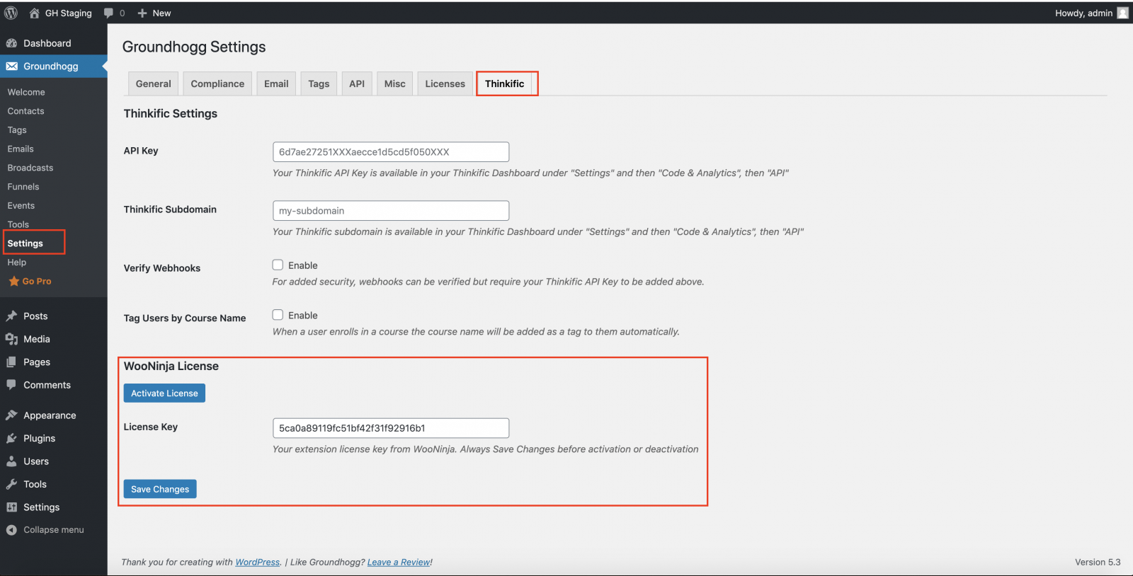From here, copy your API Key and Subdomain to your Groundhogg Thinkific Settings. I recommend you also enable Verify Webhooks. Then click Save Changes.