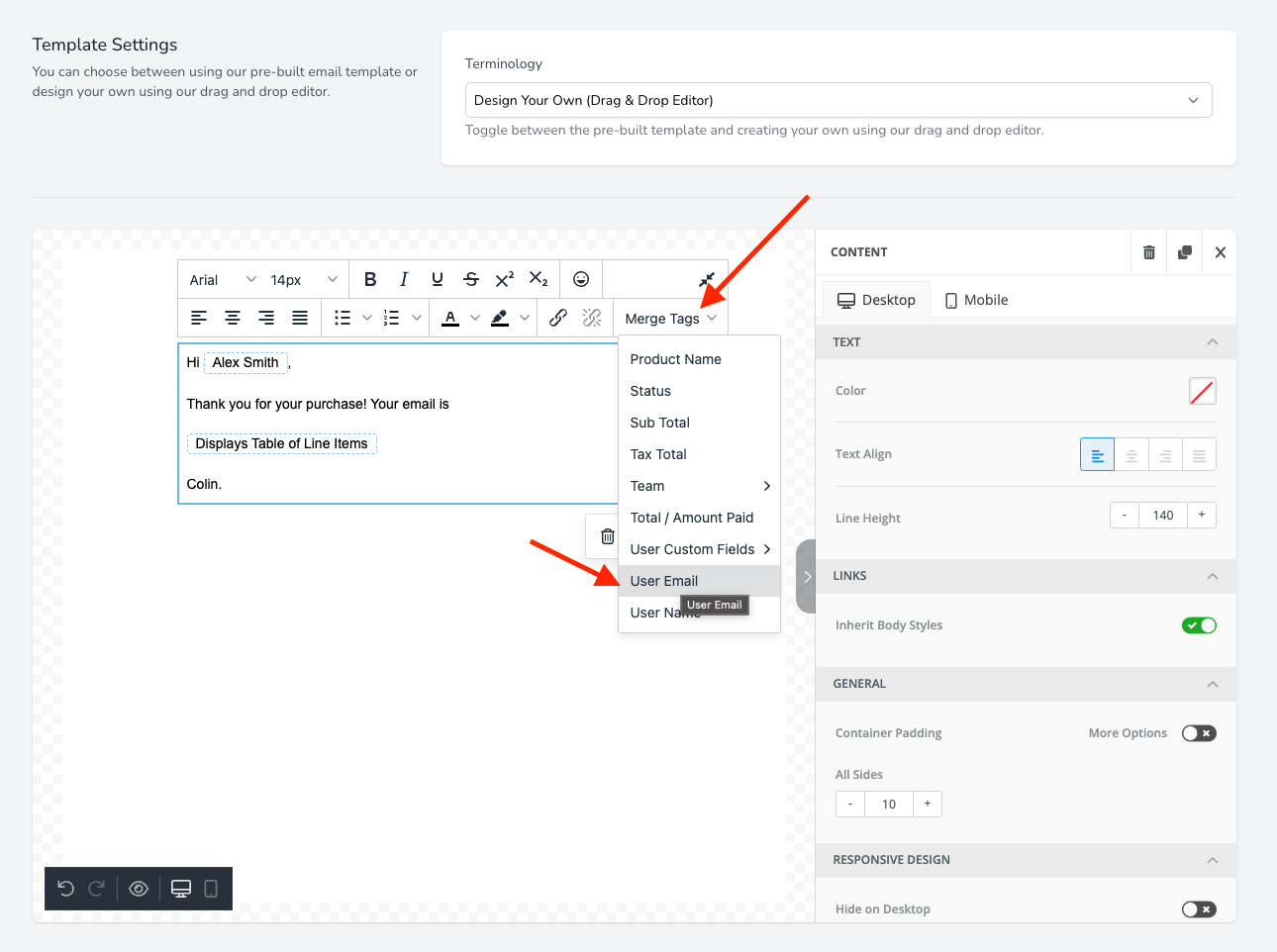 You can now drag and drop items from the toolbox on the right, into the email on the left. If you wish to personalize the text of the email for the given order, you can use Merge Tags. In the example below, we are inserting the user’s email into a text box: